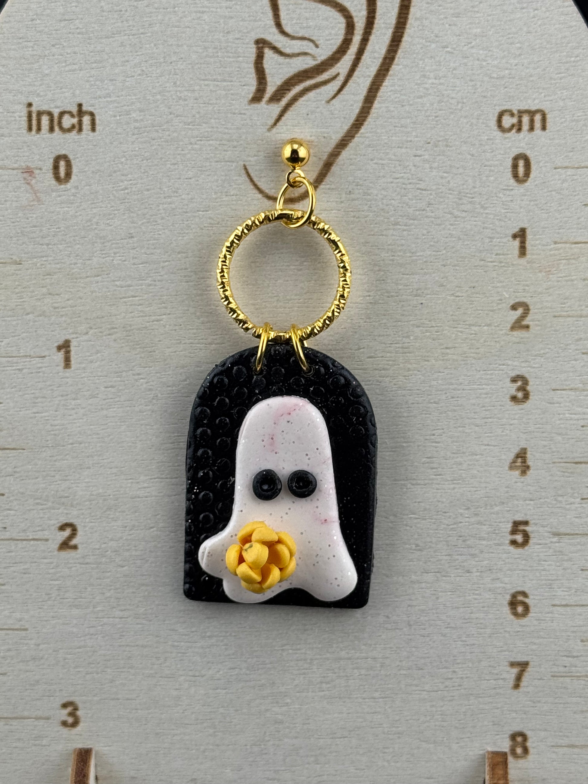 Ghost Holding a Yellow Flower on Black Arch with Gold charm and Gold Ball post Earrings
