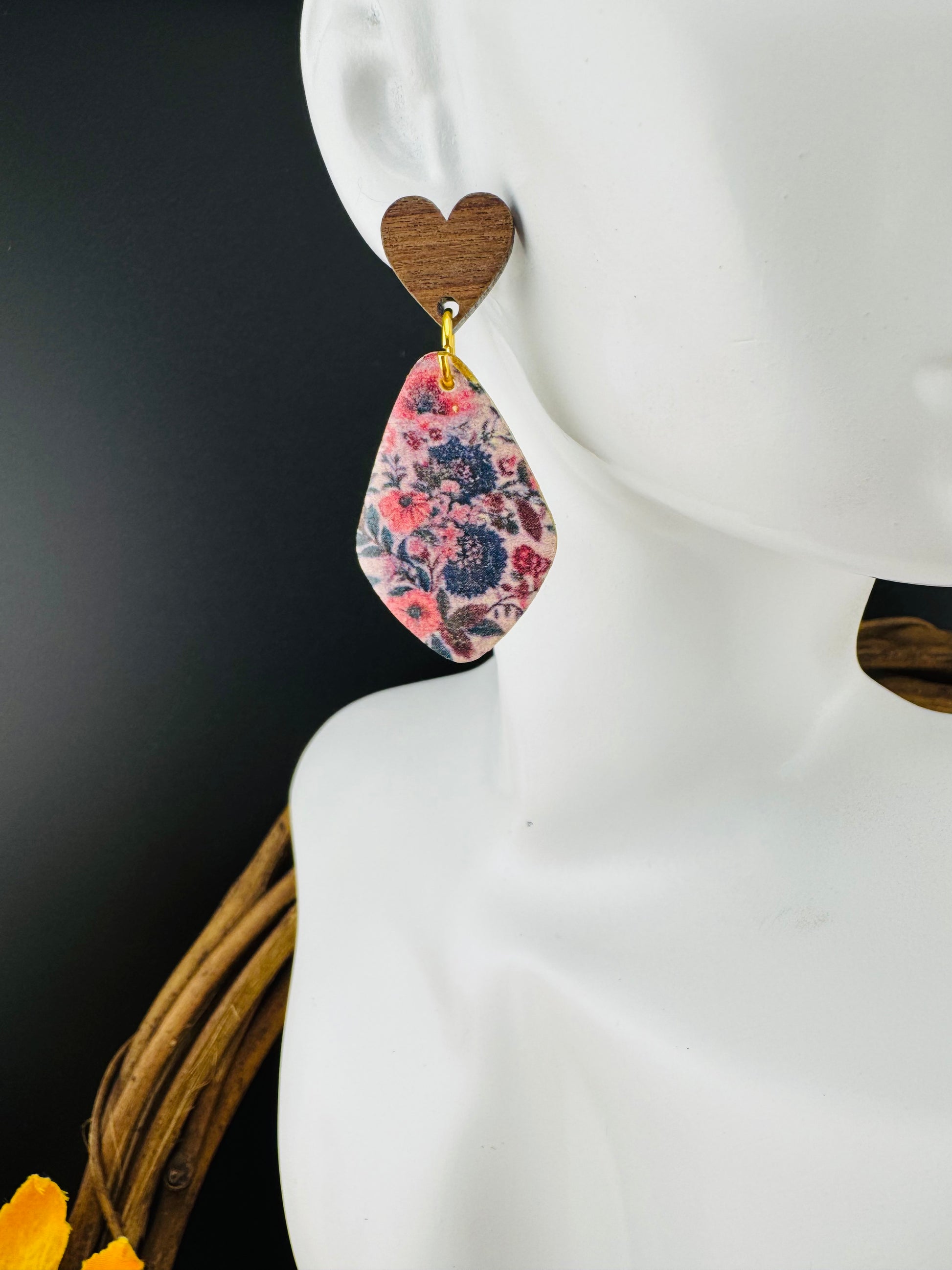 Elevate your autumn style with these Navy Blue Fall Flowers Dangle earrings featuring a charming wood heart post. Their delicate floral design in rich navy tones adds a touch of seasonal elegance, perfect for complementing your fall wardrobe. Crafted with care, these earrings bring a warm, natural vibe to any outfit. Please note, they are not hypoallergenic, so best suited for those without sensitive skin seeking a unique, eye-catching accessory this season.