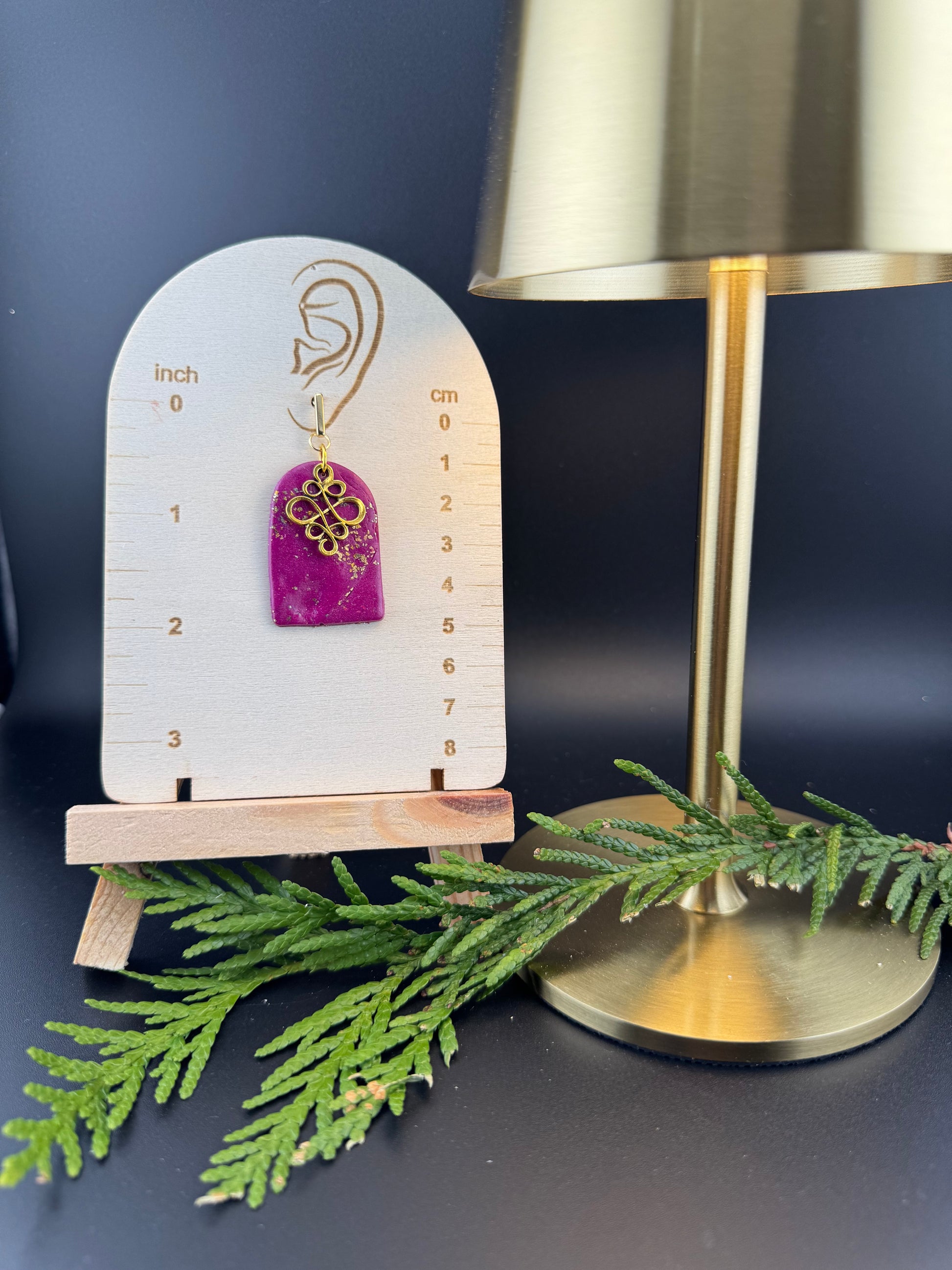 Elevate your style with these stunning earrings featuring a vibrant purple-red arch accented by glimmering gold leaf flakes. The elegant gold charm paired with sleek gold bar posts creates a sophisticated look perfect for any occasion. Add a touch of luxury and distinctive flair to your jewelry collection with these eye-catching accessories.